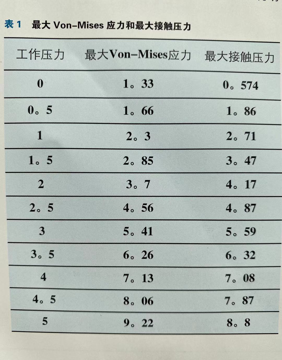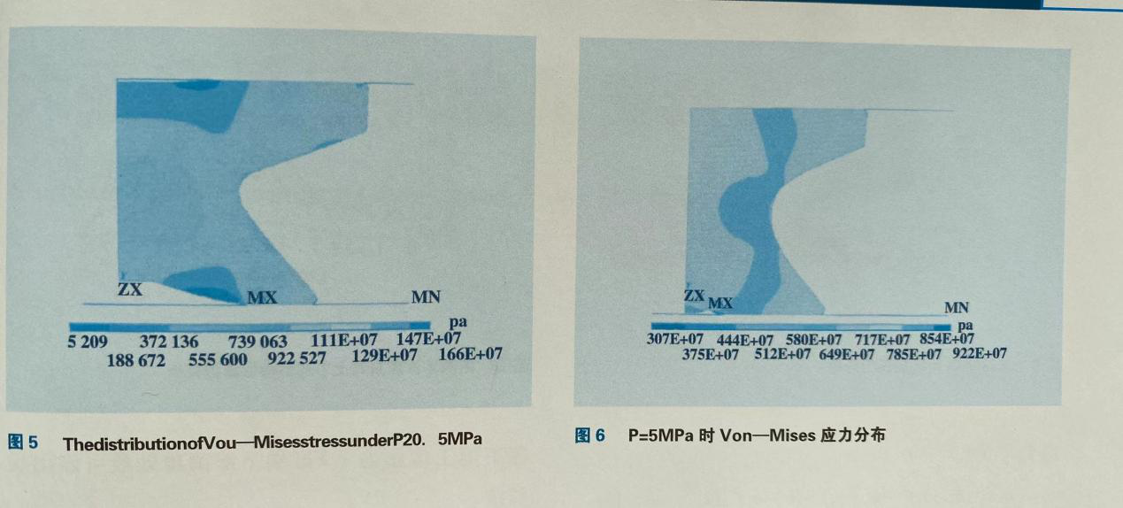 應(yīng)力也明顯增加,上下唇交匯處達(dá)到了5。8MPa.同時(shí)可以發(fā)現(xiàn)Von-Mises應(yīng)力峰區(qū)的位置發(fā)生了變化,并且主要集中在Y形圈下部倒角處。這說(shuō)明在不同工作壓力下Y形圈下部倒角處最可能出裂紋。