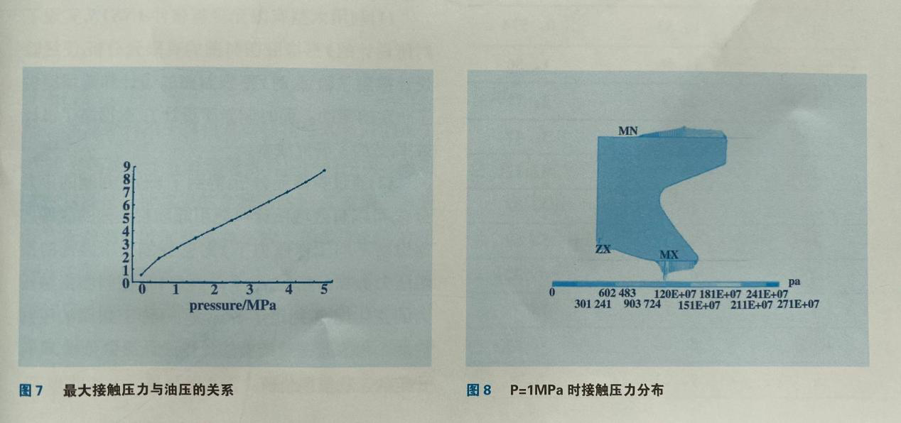 Y形圈的密封面為上下唇部,本文中主要分析了上下唇部的接觸壓力。接觸壓力的大小反應(yīng)了Y形圈的密封能力,Y形圈保證密封的必要條件是密封界面上的最大接觸壓力大于或等于油壓。0。5~5MPa10個(gè)等級(jí)工作壓力下的最大接觸壓力如