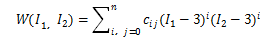 (1)式中:w為修正的應(yīng)變能,c。為Rivlin系數(shù),,l、2分別為第1、第2Green應(yīng)變不變量。